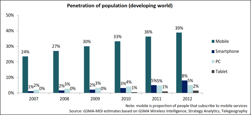 Mobile access has been growing rapidly in Africa. Across the developing world, around 40% of people now actively subscribe to mobile services. Including those with access to a mobile despite not owning one would push the connected population to well over 50%. That is a market with huge opportunities for mobile operators and other service providers.