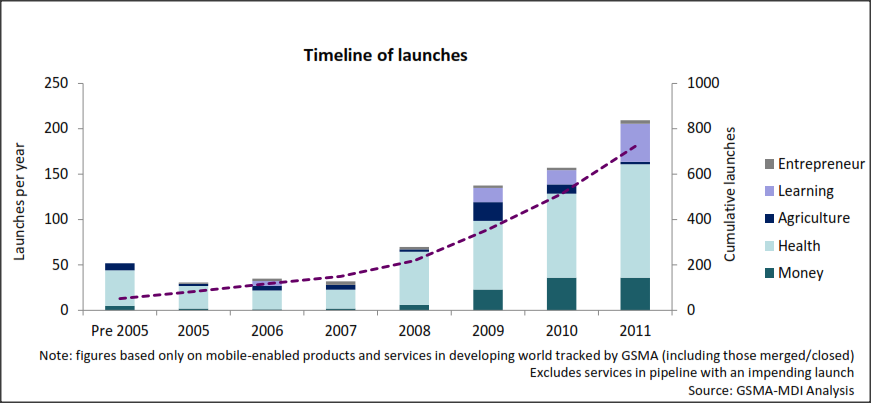 The entry point is the absence of reliable traditional services. Over 800 live services have been identified according to the report. These M4D services – mostly sms based – offer mobile alternatives in the areas of money, health, education and entrepreneurship.